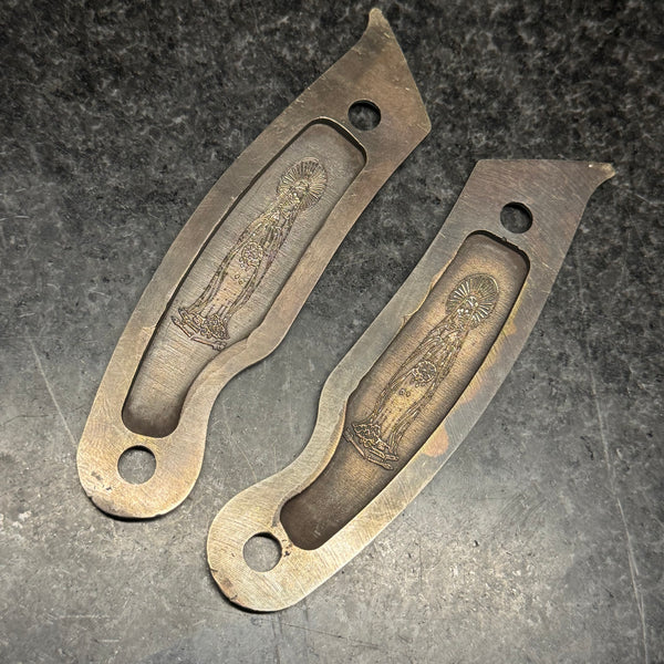 These are polyetherimide ULTEM scales for the Elvia that are slightly translucent. The inside of one scale is engraved with Santa Muerte holding the Elvia.