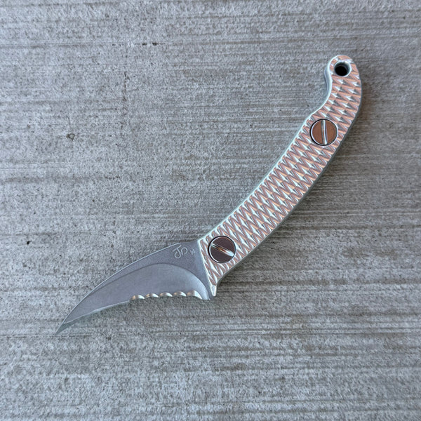 The handle scales are CNC textured and affixed with TCNC custom made 17-4 stainless hardware that is removable with a penny for field maintenance and storage of small items.
