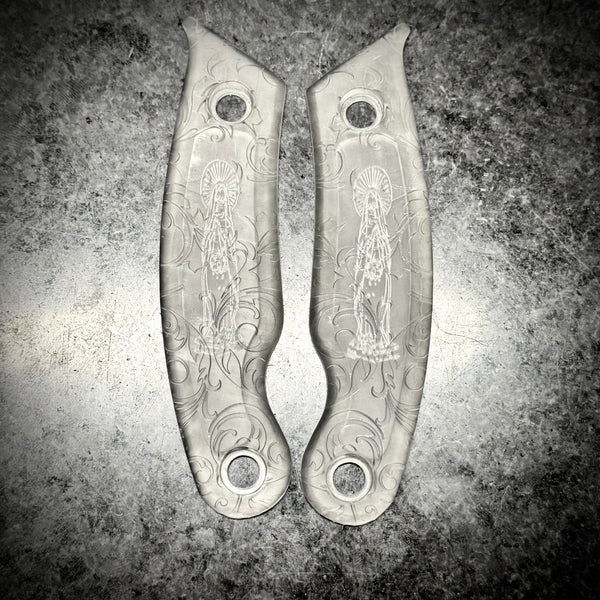 These are polyetherimide ULTEM scales for the Elvia that are slightly translucent. The inside of one scale is engraved with Santa Muerte holding the Elvia.