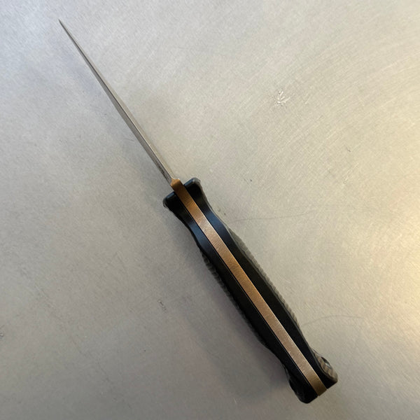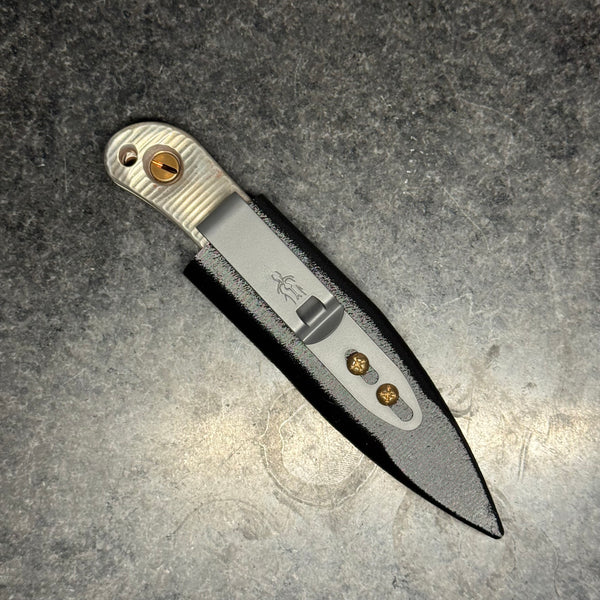 The grind is 3D CNC machined for cutting performance and a strong tip for hard use. It has a thinner profile near the heel and gets wider towards the tip. Laser engraved with the El Burro, TCNC engraving